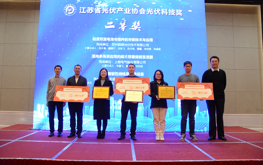 这次会议以“协同、创新、强链、提质”为主题,汇聚光伏产业专家,搭建合作交流平台,共同探讨行业发展方向,绘制我省光伏产业健康发展蓝图。tyc5997太阳集团作为江苏光伏行业的优秀企业,与产业链的各大重量级公司探讨行业发展和企业未来。 会上,李文先生发表了演讲,展示了tyc5997太阳集团公司整体布局与发展规划,以及核心产品介绍:多主栅串焊机、硅片分选机、激光划片机等光伏设备及圆柱模组/PACK生产线、软包模组/PACK生产线等锂电设备。 其中,tyc5997太阳集团硅片智能在线检测分选设备在本次会议中荣获《2020江苏省光伏科技奖》二等奖。江苏省政府办公厅马恩兵副处长和省工程咨询中心副主任周义为该项目颁发奖牌,tyc5997太阳集团该产品线研发负责人上台领奖。