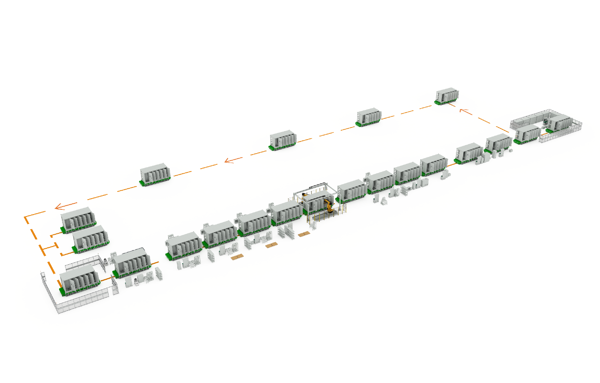 储能集装箱装配解决方案集成了集装箱装配线、重载搬运系统及仓储系统。 其工艺流程包括:集装箱上/下线、集装箱预装、安装动力线及电气系统、PACK簇安装&预紧、PACK簇拧紧、PACK簇接线、绝缘耐压测试&安装铭牌、集装箱弱电系统调试、PCS交直流测试等。